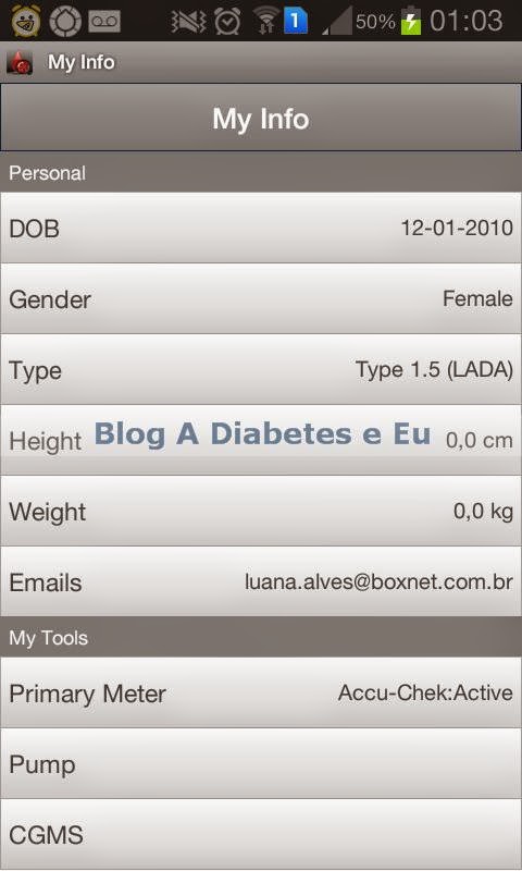 | Na parte My Info é onde colocamos nossas informações pessoais. Data de diagnóstico, sexo, tipo de diabetes, peso e altura, e-mail para envio de informações, monitor e bomba que usa. Mas tem um bug, por mais que eu tenha tentado, não consegui colocar peso e altura. O aplicativo trava e fecha enquanto está tentando salvar a informação... :( |