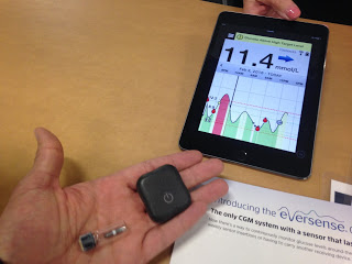 Mas talvez o sensor mais impressionante apresentado no ATTD 2016 tenha sido o da nova empresa Senseonics, Eversense. Trata-se de um sensor que é implantado sob a pele do braço na clínica do endocrinologista e dura 90 dias! Seus resultados são apresentados na tela do SmartPhone ou do Tablet e, caso longe desses dispositivos, o próprio transmissor que fica sobre a pele emite alertas vibratórios se a glicose atingir patamares baixos, altos ou estiver variando rapidamente. A empresa diz já estar aguardando liberação para começar a comercializá-lo em 2016 na Itália e em dois outros países europeus. PS. Também dependerá de 2 calibrações ao dia, com resultado do glicosímetro.