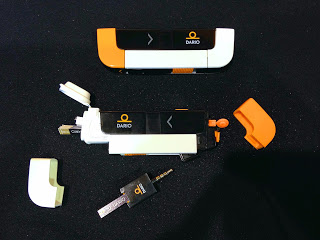Por fim, os representantes de uma empresa Israelense nos EUA apresentaram um equipamento que que pode ser considerado uma boa parte do chamado "kit pâncreas" (kit que deve ser sempre levado por quem tem diabetes tipo 1 para correções da glicemia em qualquer momento), o Dario. Trata-se de um pequeno kit, que cabe na palma da mão, e que leva dentro de si as tiras de teste, as lancetas e um pequeno glicosímetro que se conecta a qualquer celular através da saída dos fones de ouvido. Portanto, é também um moderno glicosímetro que permite a transferência imediata de valores da glicemia à nuvem, analise através de um moderno aplicativo e acesso à distância.
