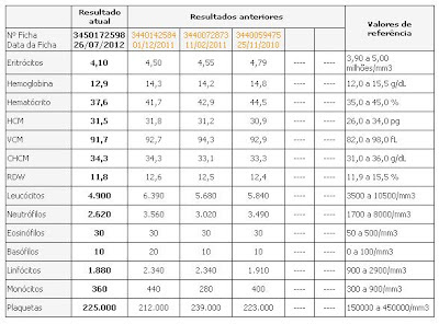 Olá, pessoal Na semana passada fiz os famosos exames trimestrais... Olha os resultados aí! Esse aqui é o hemograma... Entendo tanto quanto vocês, mas sempre dou uma olhada se está tudo dentro dos valores de referência. O que é o caso! Uebaaa! :)...